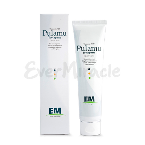Лечебно-профилактическая зубная паста с мягким отбеливающим эффектом Разработано с применением японской биотехнологии ЕМ (Effective Microorganisms). Паста мягко отбеливает зубы, очищает ротовую полость, предотвращает появление кариеса, устраняет зубной камень и неприятный запах изо рта, предотвращает гингивиты, периодонтиты (пародонтоз), улучшает внешний вид зубов и освежает ротовую полость. Подходит детям с 3 лет. Сертифицировано L.O.H.A.S., Управление по контролю лекарствами Ю. Кореи (KFDA) ЕM ДЕЛАЕТ ВАШУ УЛЫБКУ СИЯЮЩЕЙ КАК У АРТИСТА! Свойства: - по сравнению с обычными пастами уровень кремния - сильного абразива, являющегося причиной механического повреждения зубов, в пасте PULAMU EM уменьшен в 10 раз. При этом она обладает большим содержанием каолина (белая глина), что в конечном счете усиливает действие кремния без повреждения эмали. Каолин способствует снятию зубного камня и мягкому отбеливанию. - не содержит фтора - катехин содержит полифенол, обладающий имунноповышающим действием, убивает st